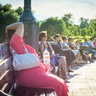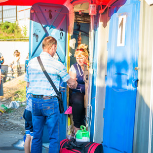 biļetes tualetes būdiņā un mūzikas grupu kuru diriģē vīrietis. Tādās vietās var
